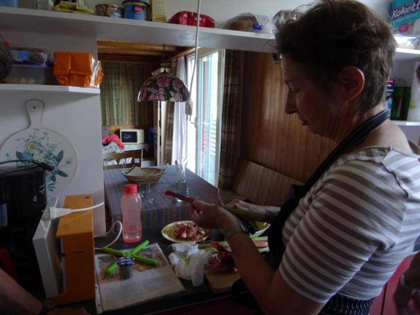 Blick vom Esszimmer in die Küche mit dekorierender Köchin